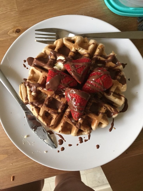 Golden, crispy waffles cooked to perfection and topped with strawberries.
